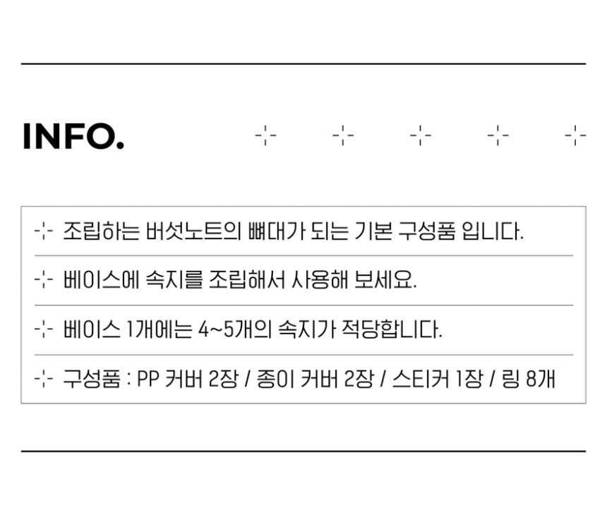 PP 커버 2개 / 바인딩 링 8개 / 커버 종이 2개 / 스티커 2개
